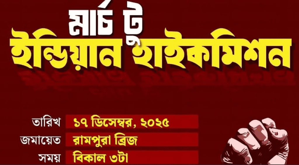 জুলাই গণহত্যা এবং ছাত্র–জনতার অভ্যুত্থানে ক্ষমতাচ্যুত সাবেক প্রধানমন্ত্রী শেখ হাসিনাসহ হত্যাকাণ্ডে জড়িতদের দেশে ফিরিয়ে দেওয়ার দাবিতে এবং ভারতের কথিত রাজনৈতিক হস্তক্ষেপ ও গণমাধ্যম ষড়যন্ত্রের অভিযোগে ‘জুলাই ঐক্য’ ‘মার্চ টু হাইকমিশন’ কর্মসূচি ঘোষণা করেছে। বুধবার (১৭ ডিসেম্বর) দুপুর ৩টায় এই কর্মসূচি পালন করা হবে।
