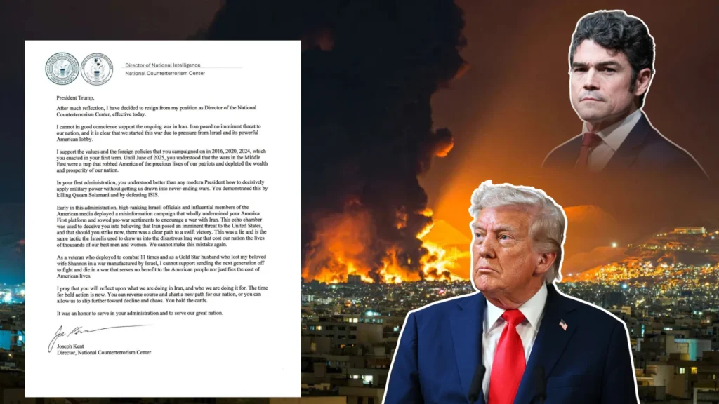 যুক্তরাষ্ট্রের ন্যাশনাল কাউন্টারটেরোরিজম সেন্টারের পরিচালক জোসেফ কেন্ট তার পদ থেকে পদত্যাগ করেছেন। প্রেসিডেন্ট ডোনাল্ড ট্রাম্পের কাছে পাঠানো এক চিঠিতে তিনি অবিলম্বে এই পদত্যাগের ঘোষণা দেন। ইরানের বিরুদ্ধে চলমান মার্কিন সামরিক অভিযানের বিরোধিতা করেই তিনি এই সিদ্ধান্ত নিয়েছেন বলে জানিয়েছেন।