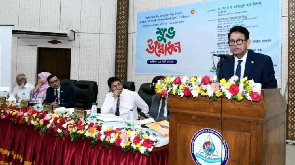 নানা সীমাবদ্ধতা ও চ্যালেঞ্জ থাকা সত্ত্বেও শিক্ষকদের নৈতিক ও পেশাগত দায়িত্ব যথাযথভাবে পালনের নির্দেশ দিয়েছেন শিক্ষা এবং প্রাথমিক ও গণশিক্ষা মন্ত্রী ড. আ ন ম এহছানুল হক মিলন। রবিবার (২৯ মার্চ) রাজধানীর জাতীয় শিক্ষা ব্যবস্থাপনা একাডেমিতে (নায়েম) নতুন জাতীয়করণকৃত কলেজ শিক্ষকদের প্রশিক্ষণ কার্যক্রমের উদ্বোধন অনুষ্ঠানে তিনি এ নির্দেশনা দেন।